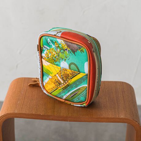 エレガントなスカーフ柄を施したスクエア型のポーチ。華やかで上品なデザインが特徴で、小物収納に便利なアイテムです。