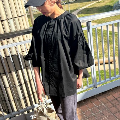 フロントのボタンデザインがクラシカルな印象を与え、袖のシャーリングディテールが程よいボリューム感を演出します。