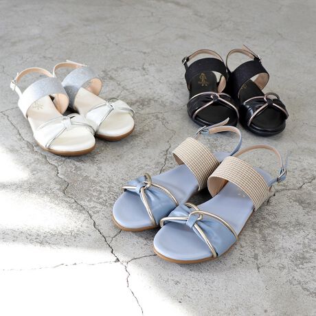 足元でキラッと光るメタリックのチューブがほどよいアクセントに。幅広の甲バンドにもラメ糸を織り込み、カジュアルながらもフェミニンで華やかな一足となっています。