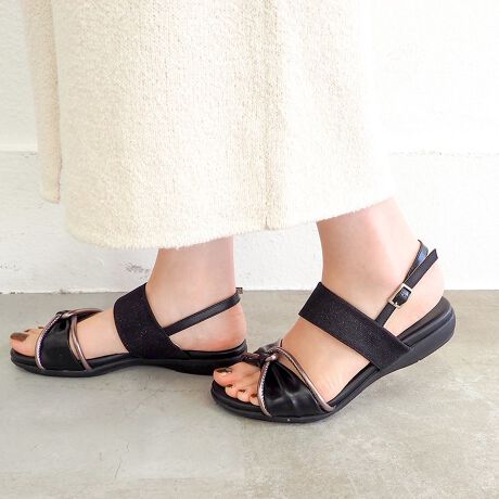 足元でキラッと光るメタリックのチューブがほどよいアクセントに。幅広の甲バンドにもラメ糸を織り込み、カジュアルながらもフェミニンで華やかな一足となっています。
