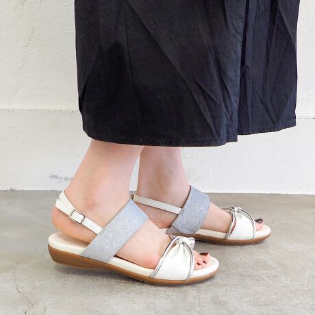 足元でキラッと光るメタリックのチューブがほどよいアクセントに。幅広の甲バンドにもラメ糸を織り込み、カジュアルながらもフェミニンで華やかな一足となっています。