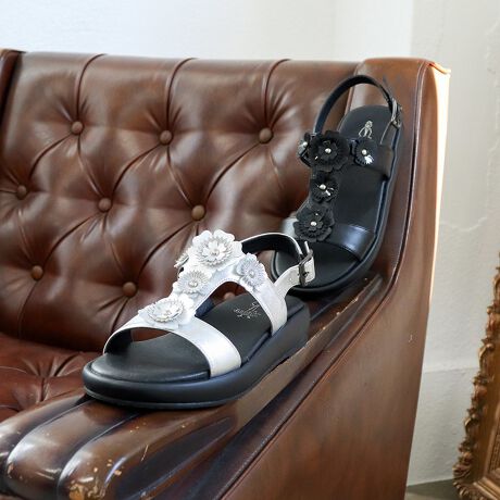 甲に散りばめたフラワーモチーフが目を惹く、ほんのりキュートなサンダル。甘さのあるフラワーデザインも、ブラックベースのシックなカラーでまとめることでほんのりモード感漂う一足に。ほどよい甘辛ミックスでカジュアルスタイルにも、フェミニンなコーデにも合わせられます。