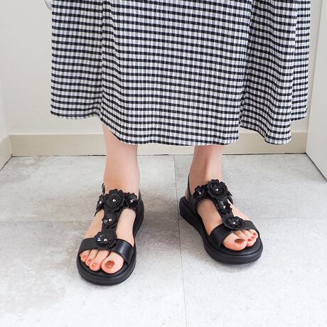 甲に散りばめたフラワーモチーフが目を惹く、ほんのりキュートなサンダル。甘さのあるフラワーデザインも、ブラックベースのシックなカラーでまとめることでほんのりモード感漂う一足に。ほどよい甘辛ミックスでカジュアルスタイルにも、フェミニンなコーデにも合わせられます。