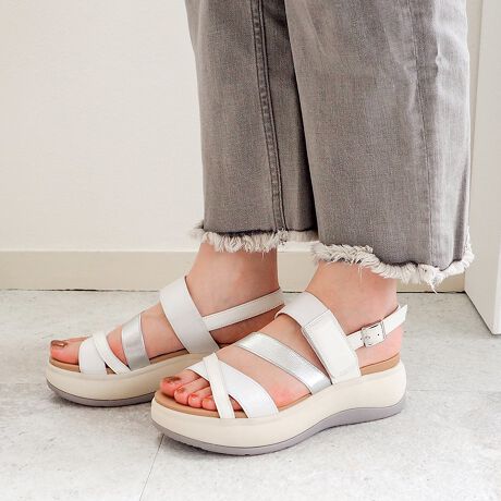 ヒール感のあるデザインや、差し色のメタリックカラーで足元きれい見え。カジュアル過ぎず、ほんのりフェミニンな雰囲気もこのサンダルの魅力。きれいめなコーデとも合わせやすくなっています。