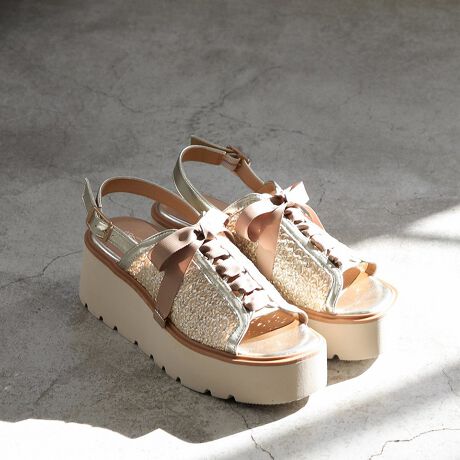 夏のリゾートシーンに最適なラフィア素材を使用した厚底サンダル。トレンドのバレエコアを連想させるリボンディティールがポイントです。