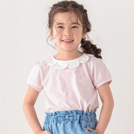 花びらが重なったようなスカラップの襟がキュートな半袖Tシャツ。
