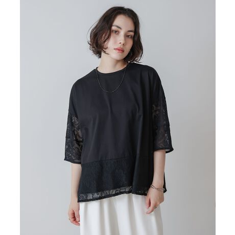 袖と裾をエレガントなレースに切り替え、華やかさをプラス。大人の女性らしい品のいい肌見せを演出し、いつものおしゃれをアップデートできる1枚。ドロップショルダーがなめらかな肩のラインを強調し、着こなしをやわらかな雰囲気にまとめます。