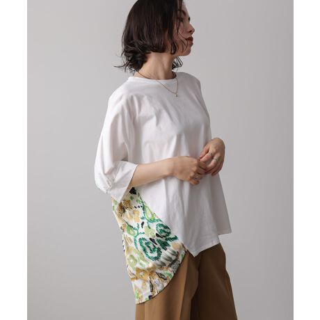 背中部分にダイナミックな柄素材をドッキングしているので、1枚で様になります。前身頃のカットソー部分は、毛羽立ちしにくい加工をしているので、キレイな印象があり女性らしい印象のカットソーです。加工のおかげで長くキレイな状態がたもたれます◎
