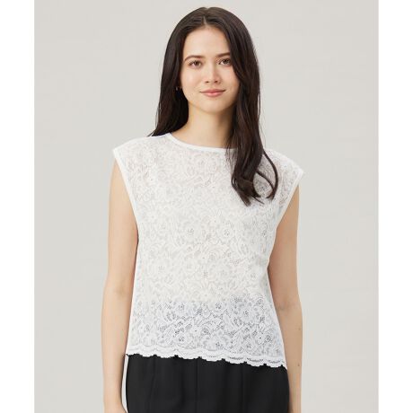 フロントの女性らしい繊細なレースが華やかなニット■デザイン前身頃にレースをあしらったブラウスライクなスリーブレスニットです。後ろがニットになっているため、きちんと見えながらも快適な着心地です。同素材のカーディガン(KRWRGM0453)とアンサンブルで着て頂くのもおすすめです。■素材レーヨンとストレッチポリエステルを撚糸した糸を使用しております。ストレッチ性があるので動きやすく、身体に馴染みやすいのでストレスフリーな着心地です。撚りを強くかけているので、表面がクレープ状になっており、ドライタッチなシャリ感と清涼感がありながら、エレガントなドレープ性を合わせ持った素材です。後ろのニット部分には接触冷感、UVカット機能が付いた素材を使用しております。前身頃はポリエステルとレーヨン素材の花柄をエレガンスに落とし込んだレース素材です。■同素材アイテムプルオーバーニット(KRWRCM0452)Aラインニット(KRWRGM0451)カーディガン(KRWRGM0453)