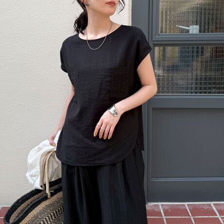 ・フロントのポケットがポイントのシンプルなフレンチスリーブシャツです