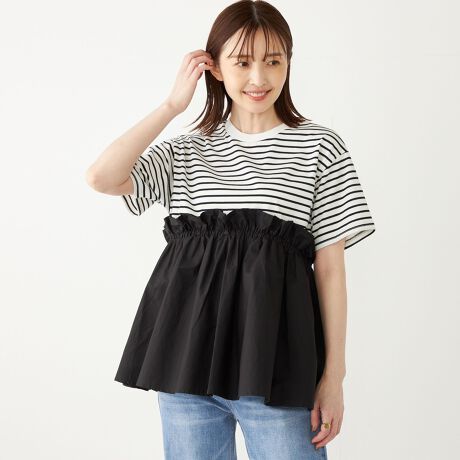 カットソー部分がカジュアルな印象で甘くなりすぎず、大人の方も着やすいアイテムに仕上げています。