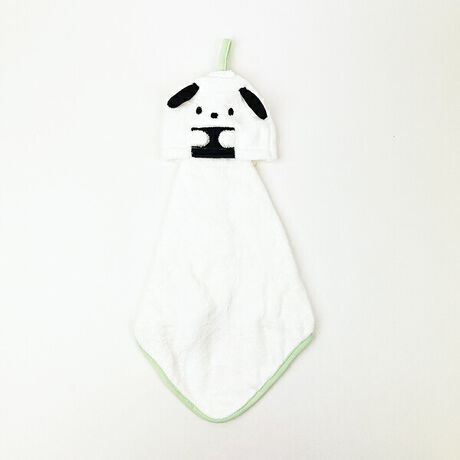 折りたためるので持ち運びしやすく、ループ付きなのでフックにかけて使える便利なタオルです。ふわふわの手触りなのも嬉しい♪こちらはポチャッコです。