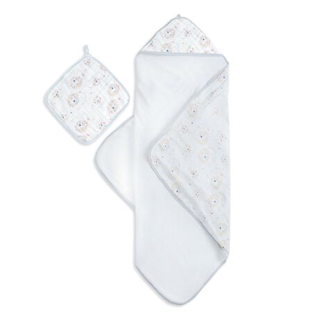 aden + anais(エイデンアンドアネイ)を代表するコットンモスリンをタオルの片面全体に施した、ふわふわのフード付きタオルとウォッシュクロスのセット。やさしい肌ざわりで赤ちゃんの体をやさしく乾かします。