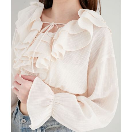 甘くなりがちな印象のフリルブラウスですが、繊細な表面変化がある素材、ドロップショルダー×クシュっとしたウエストギャザーで、甘さ控えめのカジュアルルックも実現できちゃいます!