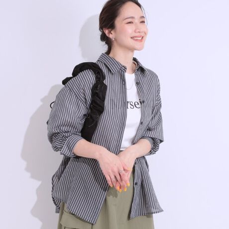 コーディネートに馴染みやすい、優しい色のストライプです。前を閉めてトップスとしても着られます。