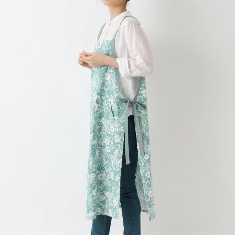 脇に太めのパイピングをあしらったサイドリボン型、腰でリボン結びをすることで紐がアクセントになる背付きの着心地の良いエプロンです。