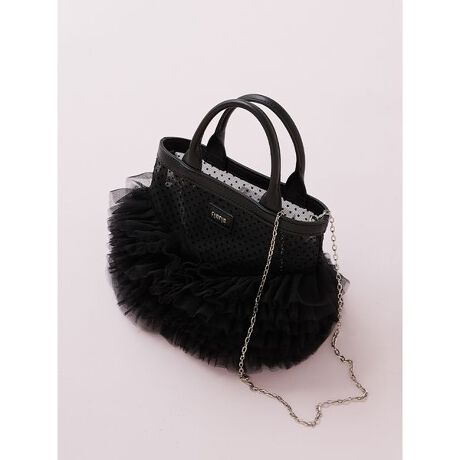 細かなチュールのフリルを裾に付けてチュチュスカートのような表現をした、FURFURらしいフェミニンなバケット型のミニバッグです。ドットフロッキーのメッシュ素材を使用した本体はシアー感を楽しめる素材になっています。スマホがすっぽりと入るサイズ感で、取り外し可能なチェーンショルダーは長さを変えて2WAYで使用いただけます。本体にも持ち手付きで使い勝手が良いよう工夫されています。上品なロゴカシメがアクセントになっています。