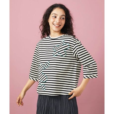 合わせやすいボーダーのTシャツ。お花の形のアップリケが大人かわいい印象を与えます。裾丈はやや短く、身幅はゆとりのあるシルエット。袖は半端袖で装飾のないシンプルなお仕立てです。アップリケ刺繍部分とカフスは地の目を変えてボーダー柄を崩したデザインがポイントに。ロングシーズン着用でき、楽な着用感が嬉しいアイテムです。