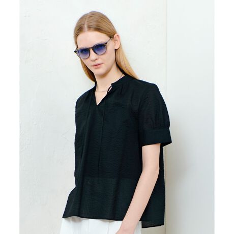 夏らしい表面感が特長のリップル素材を使用したスタンドカラーブラウス。