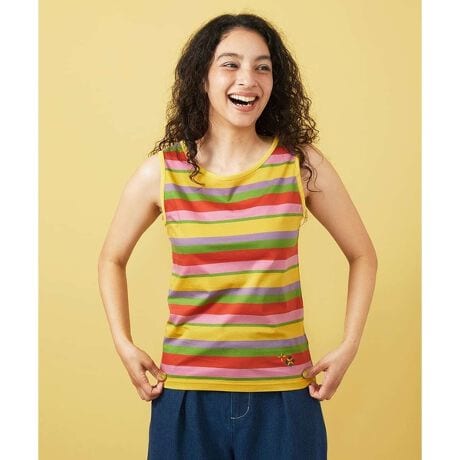 ホコモモラで毎年定番のインナーシリーズ。ボーダー柄を活かしたシンプルなシルエットです。印象的な色使いと左前の裾にワンポイント刺繍を入れて、ホコモモラらしいデザインにお仕立てしました。デイリー使いにぴったりなタンクトップはヘビーユース間違いなしのアイテムです。