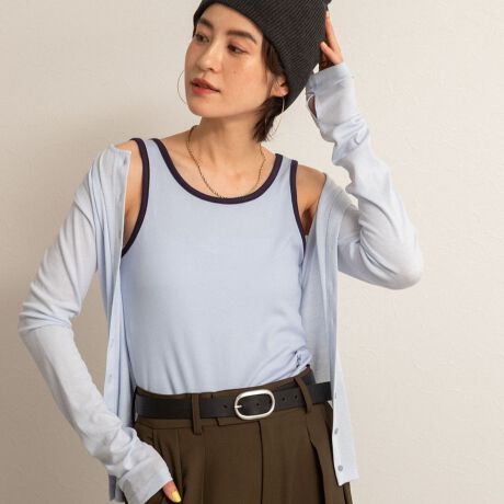 ・トレンドのリンガーデザインも細リブにすることでカジュアルすぎず取り入れやすいアイテムに