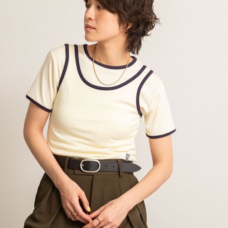 ・クリーム・サックスは同色のリンガーリブT(5-0039-2-03-004)に重ねて着るのもおすすめ