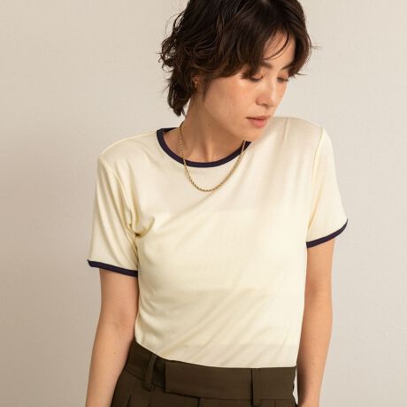 ・トレンドのリンガーデザインも細リブにすることでカジュアルすぎず取り入れやすいアイテムに