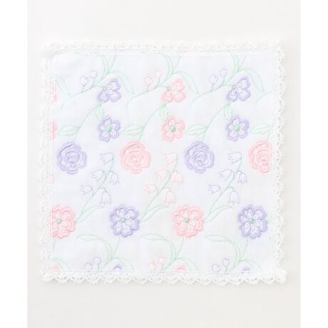 [型番:TWTWGM0051]バラやスズランなど人気の花々の多色刺繍が全面に施された華やかでエレガントなイメージのタオルハンカチーフです。枚持ちにも便利なミニサイズで、小さいバックにも入れやすいです。