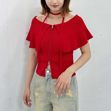 ケープカラーWzipオフショルニット