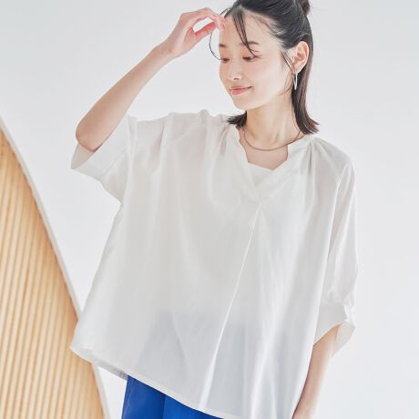 清涼感のあるデザインが魅力の、リラクシーなスキッパーブラウス。顔まわりをすっきり見せてくれるネックラインと、ゆったりとしたシルエットが、大人の抜け感スタイルを叶えます。