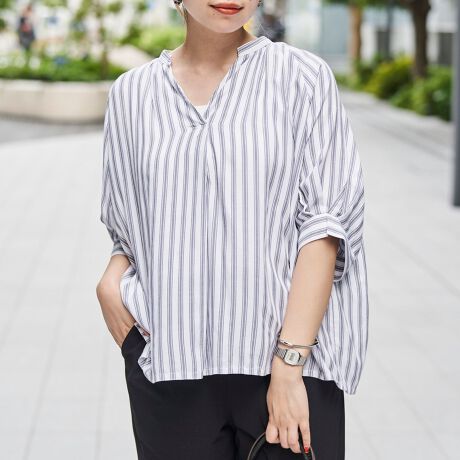 清涼感のあるデザインが魅力の、リラクシーなスキッパーブラウス。顔まわりをすっきり見せてくれるネックラインと、ゆったりとしたシルエットが、大人の抜け感スタイルを叶えます。
