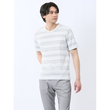 汗ばむ季節も快適に着ていただける、Vネックの半袖Tシャツです。メッシュ×ボーダー柄を組み合わせて涼しげな雰囲気に仕上げています。一枚で着るのはもちろん、ジャケットやシャツ、ベストのインナーとしても便利なアイテムです。