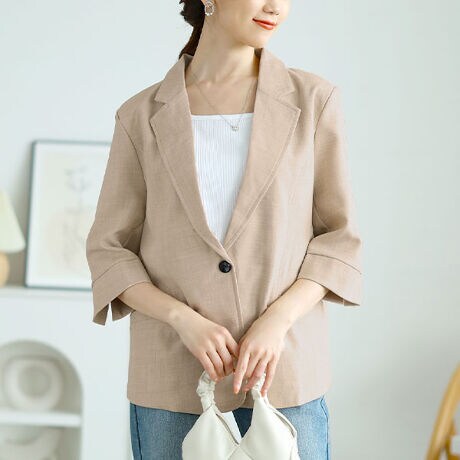 軽やかで洗練されたスタイルを完成させる、テーラードジャケットです。七分袖のジャケットは手首をすっきり見せ、腕を華奢に見せてくれます。きちんと感と抜け感のバランスを両立したジャケットはどんなコーデとも相性抜群。デニムなどと合わせて大人カジュアルに、テーパードパンツなどと合わせて通勤スタイルも◎長すぎない着丈でどんなボトムスにもバランスよく着れるのも嬉しいポイント。これからの季節に大活躍、日差し対策や冷房対策にもおすすめです。