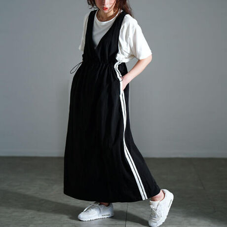 モード×スポーティで大人女子のこなれカジュアルをスタイリング☆サイドラインジャンパースカート体型を拾わないゆったり身幅でゆとりのあるリラクシーなサイズ感でご着用いただけます◎重ね着をしてももたつかない深めの腕ぐり設計でロングシーズン活躍間違いなしの一着です♪お顔まわりをスッキリ見せする深めのVネックで小顔効果も抜群◎ハイウエスト位置のドロストでシルエット自由自在♪ドロストをきゅっと絞ることでくびれを作り女性らしいシルエットもお楽しみいただけます。