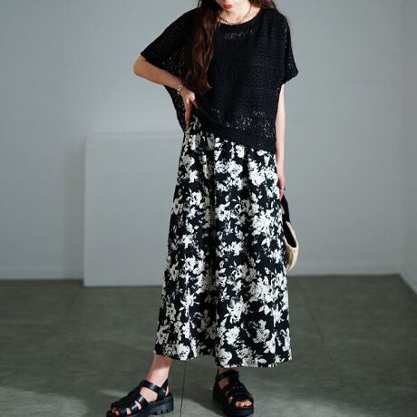 単品でも使える2点セット、かぎ編みニットトップス&異素材ロングワンピース。ニットトップスはゆったりドルマンで体型カバー&前後差裾でスッキリ見せ◎かぎ編みが肌との美しいコントラストを作ってくれます。ワンピースのウエストはゴムで楽ちん、ふんわり広がる花柄フレアスカートが華やかさを演出します。コーデに悩むことなく、即お洒落なスタイルが完成!お手持ちの洋服と合わせて着回しを楽しめるセットアイテムです。