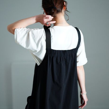 シンプルなジャンパースカートは、大人世代にも取り入れたい垢抜けアイテム。胸元や両サイドのポケットに配されたギャザーが愛らしい印象をプラスします。ふっくらとボリューム感のある立体ポケットが、さり気なく個性を感じさせる拘りある一枚。全体にゆったりとしたシルエットで、体型を丸ごとカバー。贅沢にたっぷりと生地を使用し、落ち感あるAラインで女性らしさを演出します。広めのアームホールだから、厚手のものや、ドルマンインナーにも窮屈感を感じさせません。マキシ丈のスカートで大人っぽさと上品さを演出する遊び心感じるワンピースです。