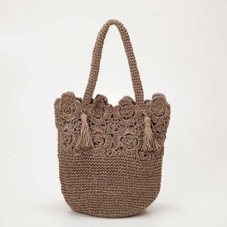 フラワーモチーフに編み上げたエレガントなデザインにタッセルがアクセント。