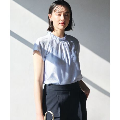 ■デザインフリルハイネックのラグランフレンチスリーブは1枚で着映えが叶います。ジャケットインやレイヤードアイテムとして着回し抜群のブラウス。インしてスカートスタイルにも、裾にスリットも入っているのでアウトしてパンツスタイルにもおすすめです。スタンドフリル襟からのギャザーは程よく身体から離れ、袖はフレンチスリーブなので気になる二の腕もカバーしてくれます。