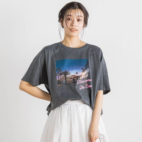 リゾートムード溢れるフォトプリントにネオン風のロゴデザインが映えるTシャツ。