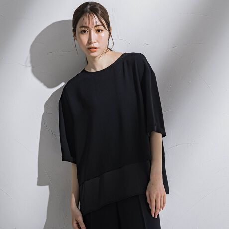 素材のドレープ性を活かしたティアードデザインで女性らしく仕上げたTブラウス。