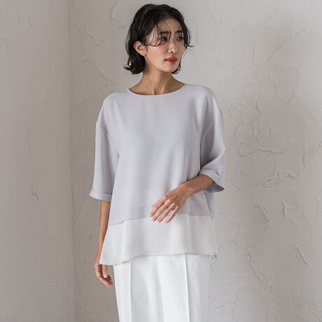 素材のドレープ性を活かしたティアードデザインで女性らしく仕上げたTブラウス。
