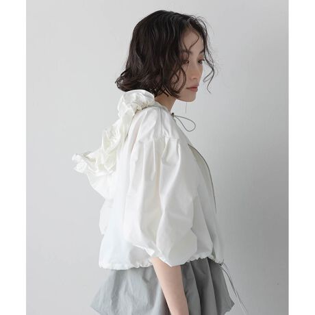 フードの大ぶりなフリルデザインが目を惹く、360度着映えするマウンテンパーカー。