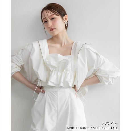シンプルなボトムと合わせる事で、フリルが程よいアクセントになり、女性らしさを引き立てます。