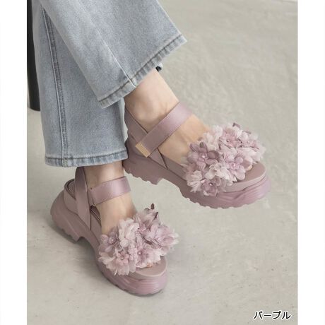 様々な素材を組み合わせ、繊細なボリューム感にこだわったフラワースポーツサンダル。