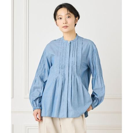 ランダムなピンタックが魅力のポイントです。肌にまとわりつかず、さらりとした素材感を活かしたデザインで、綿の風合いとスタンドカラーが、きちんとした印象とナチュラルな雰囲気を両立させています。袖口はゴム仕様になっており、袖丈の調節が簡単にできるため、着こなしの幅が広がります。さらに、トレンドのジレスタイルとの相性も抜群です。 ・水洗い可■素材■40/1のインディゴ染料で染め上げた糸を使用したシーチング素材。力織機を使用し、糸にかかるテンションを抑えつつ、丁寧に織り上げた生地は膨らみ感があり、綿本来の優しい風合いを最大限に生かしています。程よい手持ち感がありつつもさらっとした肌離れ感を残し、優しい柔らかさを兼ね備えています。洗う事でまたナチュラルな風合いを楽しめる素材です。