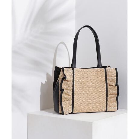 両サイドのフリルディテールにあしらった、バイカラーのパイピングがポイントのトートバッグ。天然素材見えする軽やかな風合いながらしっかりとした作りなので、きちんとキレイめな印象です。ショルダーストラップは肩から提げられる長さに設定。口元はファスナーでしっかりと閉じることができ、防犯面も安心です。底面は平らをキープできるしっかりとした作りなのでお弁当箱も入る優れもの。背面外側にはマグネットホックで留まるオープンポケット付きです。<詳細>バイカラークロ:フリルディテール裏がクロオフ・クロ:フリルディテール裏がベージュ※モデルの着用画像の場合、光の当たり具合により、実際の色味と異なって見えることがございます。色味は、商品単体の画像をご参照ください。