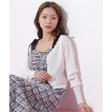 肌離れが良くサラッとした糸を使用した、トレンドの透かし編みディテールのカーディガン。スカラップを少し尖り気味の形にし、甘くなりすぎないよう配色を効かせたデザインもポイント。ボタンを留めてトップス風にも、冷房対策の羽織りにも使いやすいデザインです。※撮影時照明の関係により、色味が違って見える場合がございます。またパソコン・スマートフォンなどの環境により、若干製品と画像のカラーが異なる場合もございます。予めご了承ください。商品の色味は、商品単品画像をご参照下さい。※商品画像はサンプルのため、色味やサイズ等の仕様に変更がある場合がございますので、予めご了承ください。