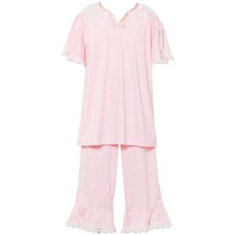 【女児用パジャマ】トップス袖丈:半袖(3分袖)・ボトム脇丈:7分丈・かぶりタイプ【ワコール プレミアム】キラキラ、ふわふわ、かわいいものにいつも囲まれていたいお子さまのために、素材やディテールにこだわったプレミアムグループ●襟のアイラッシュレースとリボンがエレガント●Vラインのネックやふわっとしたチューリップ袖など、ラインやシルエットに工夫を凝らしたデザイン●本体は、シルケットバイオ加工をほどこした、上質な細い番手の超長綿混の綿100%スムース素材を使用(60綿スムースシルケットバイオ素材) スムース素材は、バイオ加工により毛羽を削ぎ落としたつややかな表面に、さらにシルケット加工をほどこすことでシルクのような光沢となめらかな肌ざわりに・肌側に名前が記入できるネーム付き・ボトムの前肌側にネームを付けることで、はく時に前後の目安になりやすい・ウエストゴム取り替え口あり※お洗濯は、必ず「取扱い表示」にしたがってください。