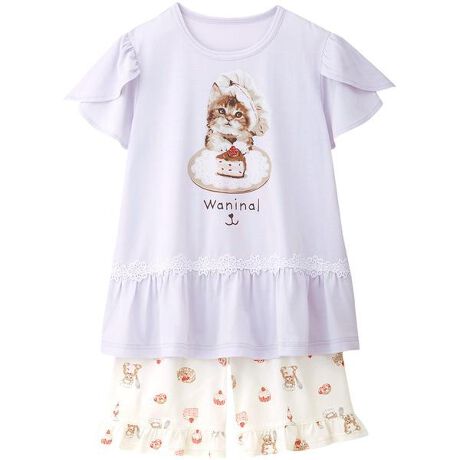 【女児用パジャマ】トップス袖丈:3分袖・ボトム脇丈:3分丈・かぶりタイプ【Waninal 家族でわになる♪家族お揃いでコーディネイトできるグループ】●トップスの大きめのイラストプリントが愛らしい、Tシャツスタイルのパジャマ パティシエになりきっている猫柄(PUカラー) 航海士になりきっている犬柄(WHカラー)●チューリップスリーブにレースモチーフ付きのデザインは、華やかでキュートな雰囲気●接触冷感素材で、触れた部分がひんやり冷たく感じる涼感素材を本体に使用(60/2綿レーヨン天竺素材)・上下で別カラーの組み合わせ PUカラー:トップスPUカラー(猫柄)/ボトムCRカラー WHカラー:トップスWHカラー(犬柄)/ボトムTUカラー ・肌側に名前が記入できるネーム付き・ボトムの前肌側にネームを付けることで、はく時に前後の目安になりやすい・ウエストゴム取り替え口あり※モデル画像は、身長122cm、6サイズを着用したイメージです【サイズ詳細】4:身幅35.5cm 着丈46.5cm 肩幅30.0cm ボトム脇丈31.5cm 裾まわり44.5cm 股下(レングス)11.5cm ウエスト46.0cm ヒップ80.5cm6:身幅39.0cm 着丈50.5cm 肩幅32.0cm ボトム脇丈35.0cm 裾まわり48.0cm 股下(レングス)13.5cm ウエスト48.0cm ヒップ86.0cm8:身幅46.0cm 着丈57.5cm 肩幅37.0cm ボトム脇丈39.0cm 裾まわり51.5cm 股下(レングス)15.5cm ウエスト52.0cm ヒップ92.5cm10:身幅50.5cm 着丈63.5cm 肩幅41.0cm ボトム脇丈46.0cm 裾まわり56.5cm 股下(レングス)19.5cm ウエスト55.0cm ヒップ103.5cm※出来上がり寸法を表示しております※サイズ詳細の寸法には多少の差異がございます