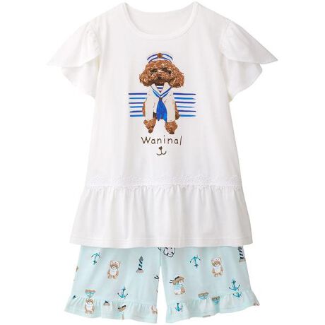 【女児用パジャマ】トップス袖丈:3分袖・ボトム脇丈:3分丈・かぶりタイプ【Waninal 家族でわになる♪家族お揃いでコーディネイトできるグループ】●トップスの大きめのイラストプリントが愛らしい、Tシャツスタイルのパジャマ パティシエになりきっている猫柄(PUカラー) 航海士になりきっている犬柄(WHカラー)●チューリップスリーブにレースモチーフ付きのデザインは、華やかでキュートな雰囲気●接触冷感素材で、触れた部分がひんやり冷たく感じる涼感素材を本体に使用(60/2綿レーヨン天竺素材)・上下で別カラーの組み合わせ PUカラー:トップスPUカラー(猫柄)/ボトムCRカラー WHカラー:トップスWHカラー(犬柄)/ボトムTUカラー ・肌側に名前が記入できるネーム付き・ボトムの前肌側にネームを付けることで、はく時に前後の目安になりやすい・ウエストゴム取り替え口あり【サイズ詳細】4:身幅35.5cm 着丈46.5cm 肩幅30.0cm ボトム脇丈31.5cm 裾まわり44.5cm 股下(レングス)11.5cm ウエスト46.0cm ヒップ80.5cm6:身幅39.0cm 着丈50.5cm 肩幅32.0cm ボトム脇丈35.0cm 裾まわり48.0cm 股下(レングス)13.5cm ウエスト48.0cm ヒップ86.0cm8:身幅46.0cm 着丈57.5cm 肩幅37.0cm ボトム脇丈39.0cm 裾まわり51.5cm 股下(レングス)15.5cm ウエスト52.0cm ヒップ92.5cm10:身幅50.5cm 着丈63.5cm 肩幅41.0cm ボトム脇丈46.0cm 裾まわり56.5cm 股下(レングス)19.5cm ウエスト55.0cm ヒップ103.5cm※出来上がり寸法を表示しております